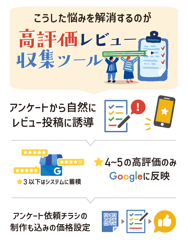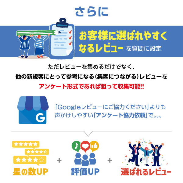 - アンケートを使って、Googleレビューが自然に集まりやすい仕組み。