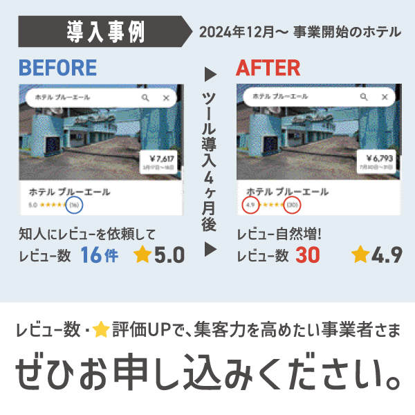 - 高評価のレビューだけにGoogleレビューの協力依頼が表示されます。